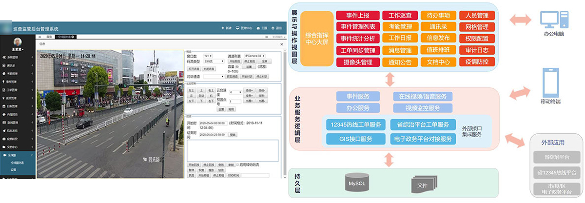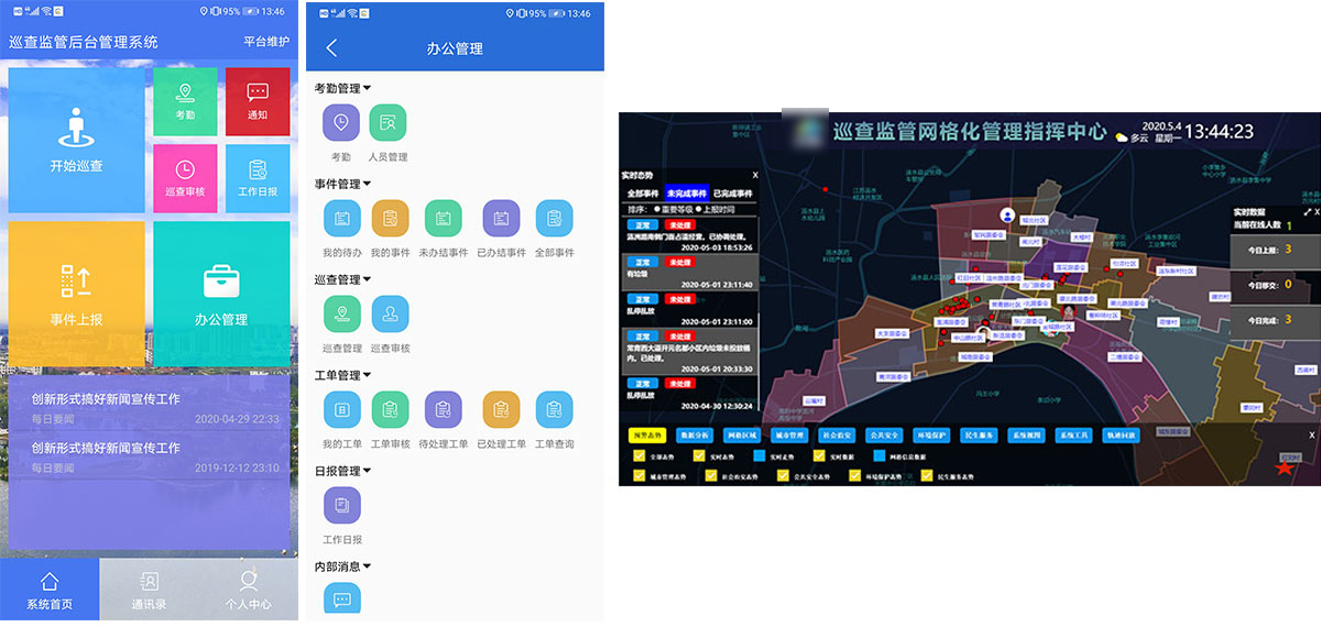 系統(tǒng)使用Java EE技術(shù)體系開發(fā),提供了電腦端和移動終端,輔助管理機(jī)構(gòu)便捷快速地感知與協(xié)調(diào)處理事件,遠(yuǎn)程巡查與指揮,在宏觀層面掌控全局城鎮(zhèn)治理情況,在微觀層面跟進(jìn)了解事務(wù)細(xì)節(jié);系統(tǒng)還融合了辦公系統(tǒng)服務(wù)等功能。