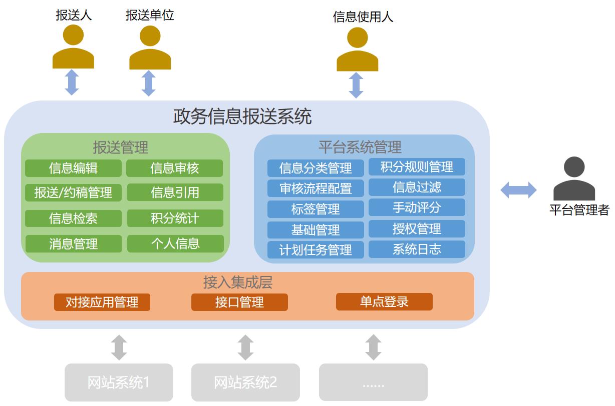 信息采集系統(tǒng)提供了信息庫(kù)管理與使用服務(wù),包括信息分類、信息報(bào)送、審核、采納、引用共享等功能,并且實(shí)現(xiàn)了定向/非定向約稿,積分制考核管理等功能。系統(tǒng)支持“一鍵式”信息引用至目標(biāo)外部應(yīng)用系統(tǒng)。